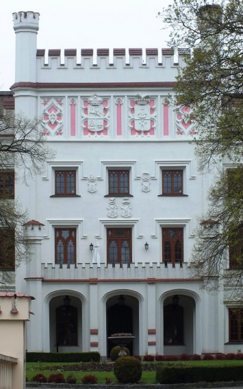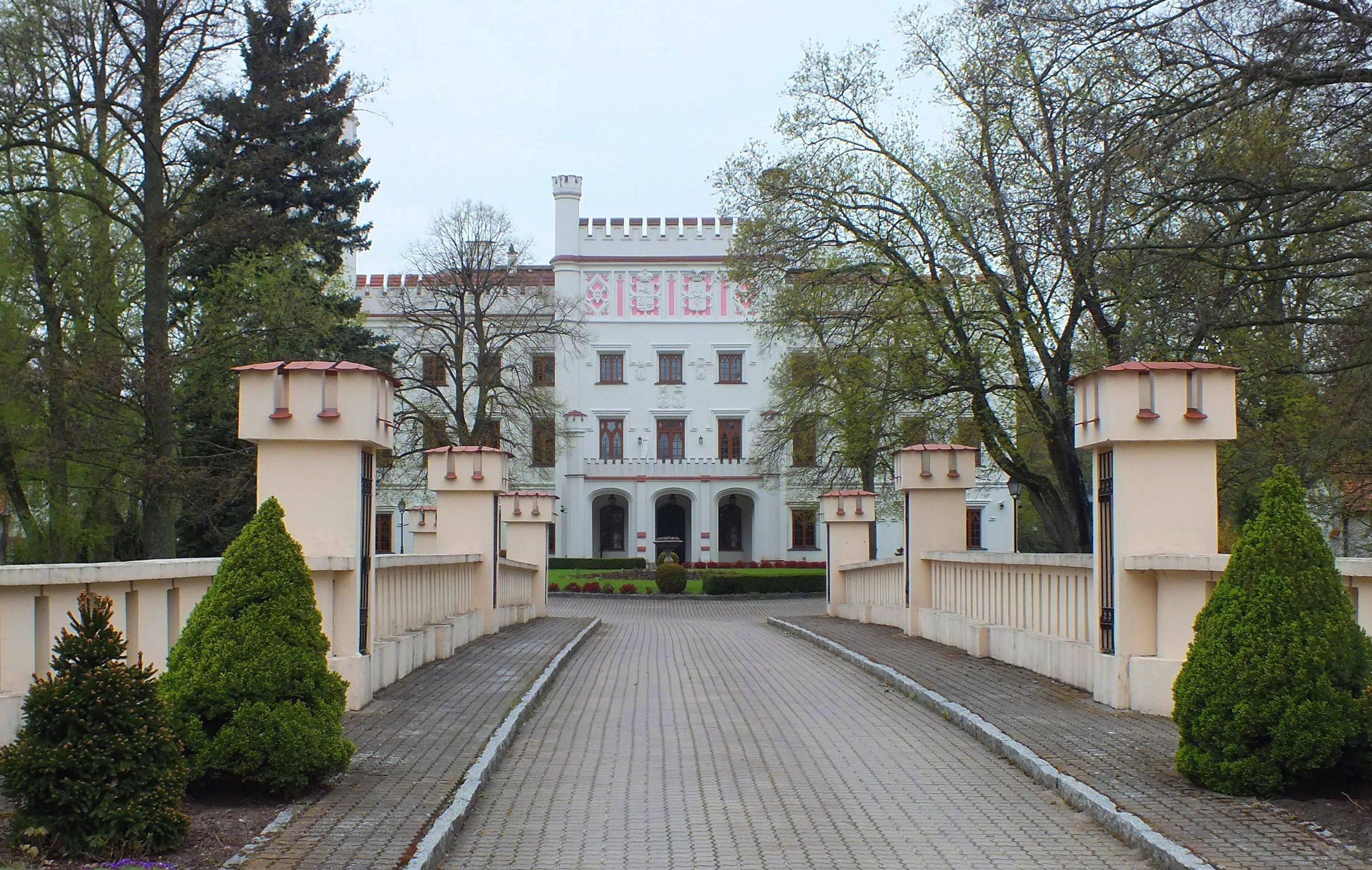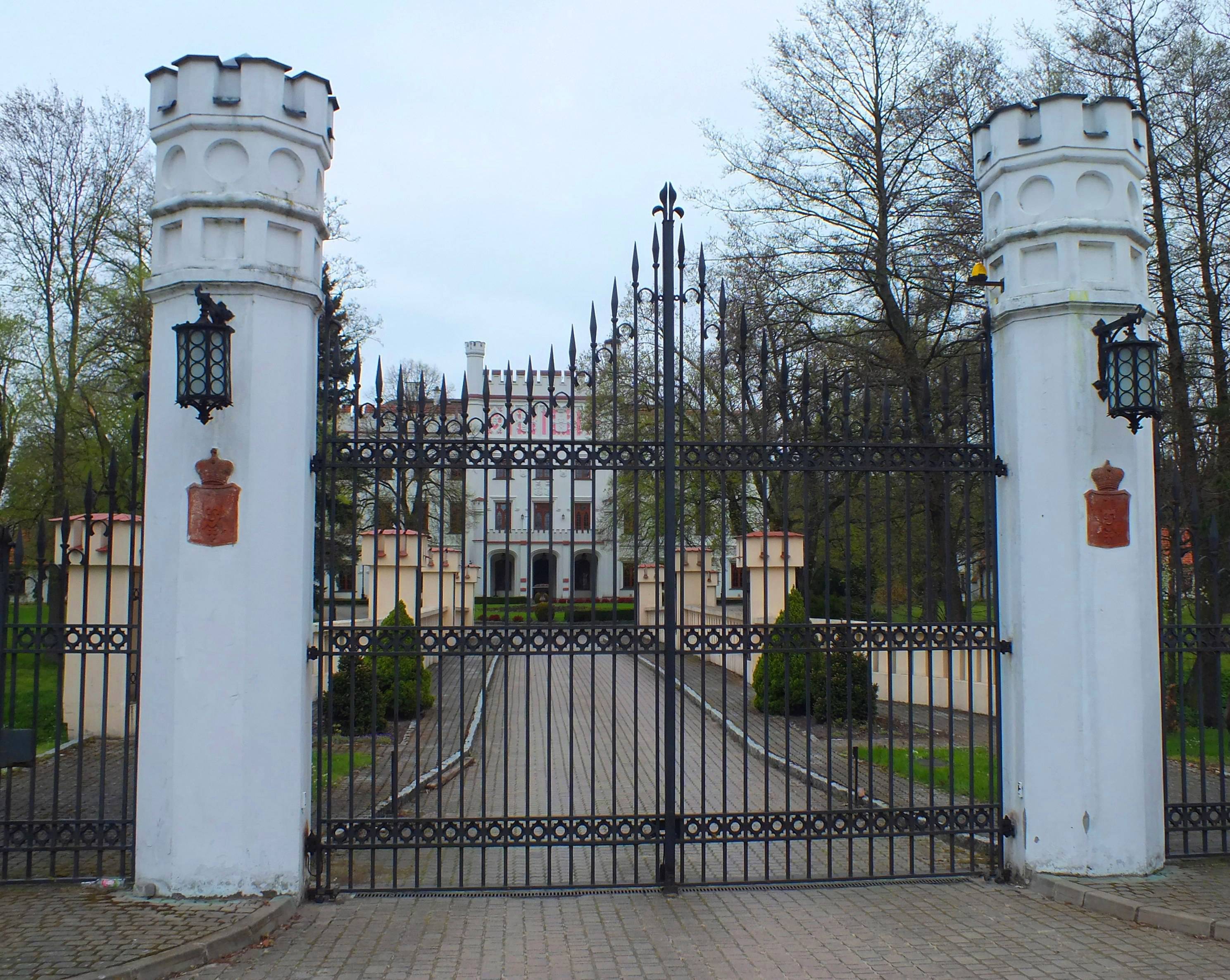 Przed pałacem, w niewielkiej odległości od głównego wejścia zbudowano - także w stylu neogotyckim - bramę wjazdową i kordegardę, a po obu jego bokach - dwie oficyny.