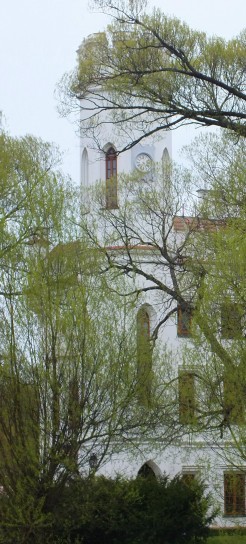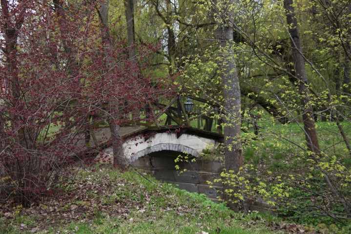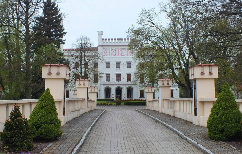 Most nad dawną fosą, w głębi elewacja frontowa pałacu |