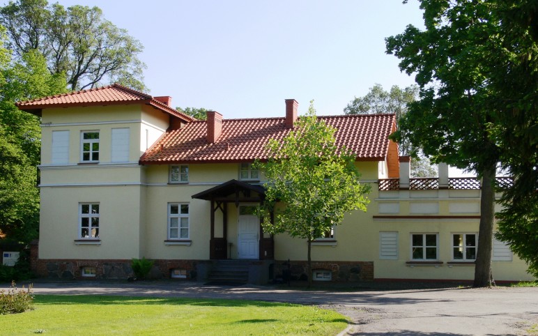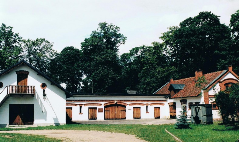 Wcześniej niż pałac, bo w początkach lat sześćdziesiątych XIX wieku, zbudowano w jego bezpośrednim sąsiedztwie oficynę, nadając jej kształt neorenesansowej willi toskańskiej, a w 1866 r. - stajnię i wozownię, usytuowane po bokach bramy wjazdowej. Były to jedyne budynki gospodarcze w obrębie założenia pałacowo-parkowego, reszta zabudowań folwarcznych znajdowała się w pobliskim Malcu. Po drugiej stronie bramy, wzdłuż alei dojazdowej wzniesiono budynki administracji dworskiej i leśniczówkę.