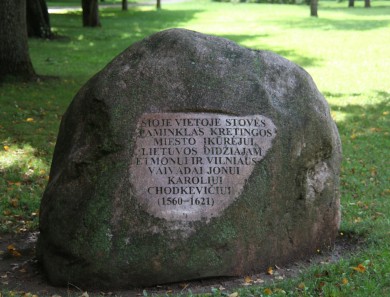 Pierwszym znanym prywatnym właścicielem Kretyngi był Jan Karol hr. Chodkiewicz (1560-1621) herbu Kościesza, hetman wielki litewski, wojewoda wileński, starosta żmudzki, naczelny dowódca wojsk polskich podczas wojny o Inflanty, pogromca Szwedów w słynnej bitwie pod Kircholmem (1605 r.). Dzięki niemu Kretynga stała się miastem na prawie magdeburskim. W 1610 roku wraz z żoną, Zofią z Mieleckich, wojewodzianką podolską ufundował kościół Zwiastowania Najświętszej Marii Panny i klasztor dla oo. bernardynów. Założyli też wspólnie szkołę parafialną. Jedyny syn hetmana, Hieronim Chryzostom Chodkiewicz zmarł w 1613 roku w wieku lat 15 i został pochowany w podziemiach kretyngowskiego kościoła. Spoczęła tam też w 1618 roku jego matka, Zofia z Mieleckich Chodkiewiczowa. Po śmierci Jana Karola Chodkiewicza w 1621 roku, który wprawdzie ożenił się jeszcze raz w 1620 roku z Anna Alojzą ks. Ostrogską, ale nie doczekał się potomka, Kretyngę przejęli Sapiehowie.