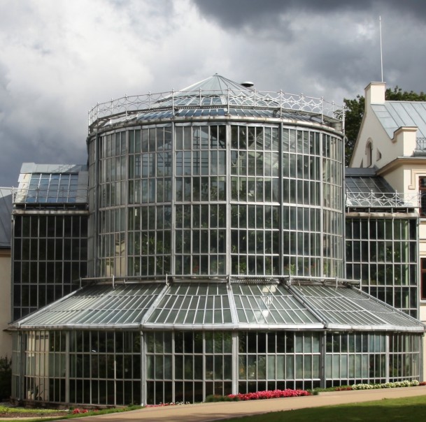 Główny jej korpus miał kształt walca, o szkielecie drewnianym, w całości oszklonym, później zamienionym na metalowy. Wysoki na trzy kondygnacje, przykryty został stożkowatym dachem. Wnętrze oranżerii, której parter został poszerzony poza obwód walca, było obszerne, mieściło trzy stawki, połączone kanałami, nad którymi przerzucono mostki. Nie zabrakło tam fontann, a nawet wodospadu, spadającego po skałach z wysokości jednego piętra. W sztucznych skałach wydrążono jaskinie i to tak duże, że w tej, w której niekiedy jadano podwieczorki, mogło zasiąść do stołu stu biesiadników. Między ciekami wodnymi rosło wiele egzotycznych roślin, takich jak agawy, araukarie, bananowce, drzewa cytrusowe, kaktusy, palmy daktylowe i olejowe. Podczas niedzielnych i świątecznych obiadów w oranżerii grała orkiestra złożona z czeskich muzyków. Ci Czesi byli jednocześnie rzemieślnikami i zostali sprowadzeni do wykonywania prac stolarskich, ślusarskich czy rymarskich, ale angażując ich postawiono warunek, że muszą być także utalentowani muzycznie.