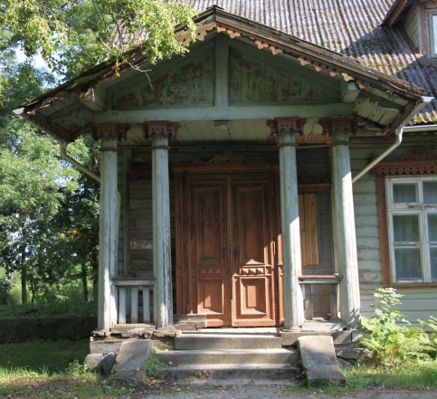 Główne wejście znalazło się w skrajnej lewej osi. Poprzedził je ganek z czterema słupami dźwigającymi trójkątny przyczółek i dwuspadowy daszek.