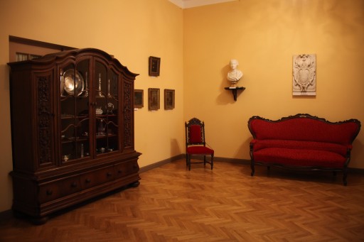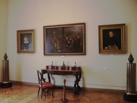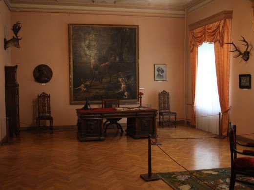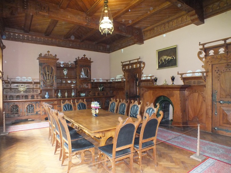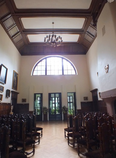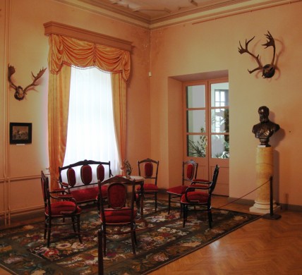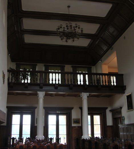 Po przebudowie pałac zyskał - w miejscu, gdzie powinna być sień - obszerny, wysoki na dwie kondygnacje salon, który można byłoby nazwać głównym, z galerią wspartą na dwóch kolumnach, z boazerią wykładającą wszystkie ściany do wysokości dwóch metrów. Powstał on z połączenia dawnej jadalni i sali bilardowej. Ogrzewał go duży kominek, oświetlał zaś wieloramienny żyrandol, zwieszony z sufitu wyłożonego również boazerią, ale tylko fragmentarycznie. Do jego bocznej, prawej ściany przylegała klatka schodowa umożliwiająca tylko zejście na dół, do najniższej kondygnacji, której pomieszczenia nie zmieniły poprzedniego przeznaczenia. Dębowe schody biegnące do góry, na trzecią kondygnację, znalazły się po lewej stronie salonu.
