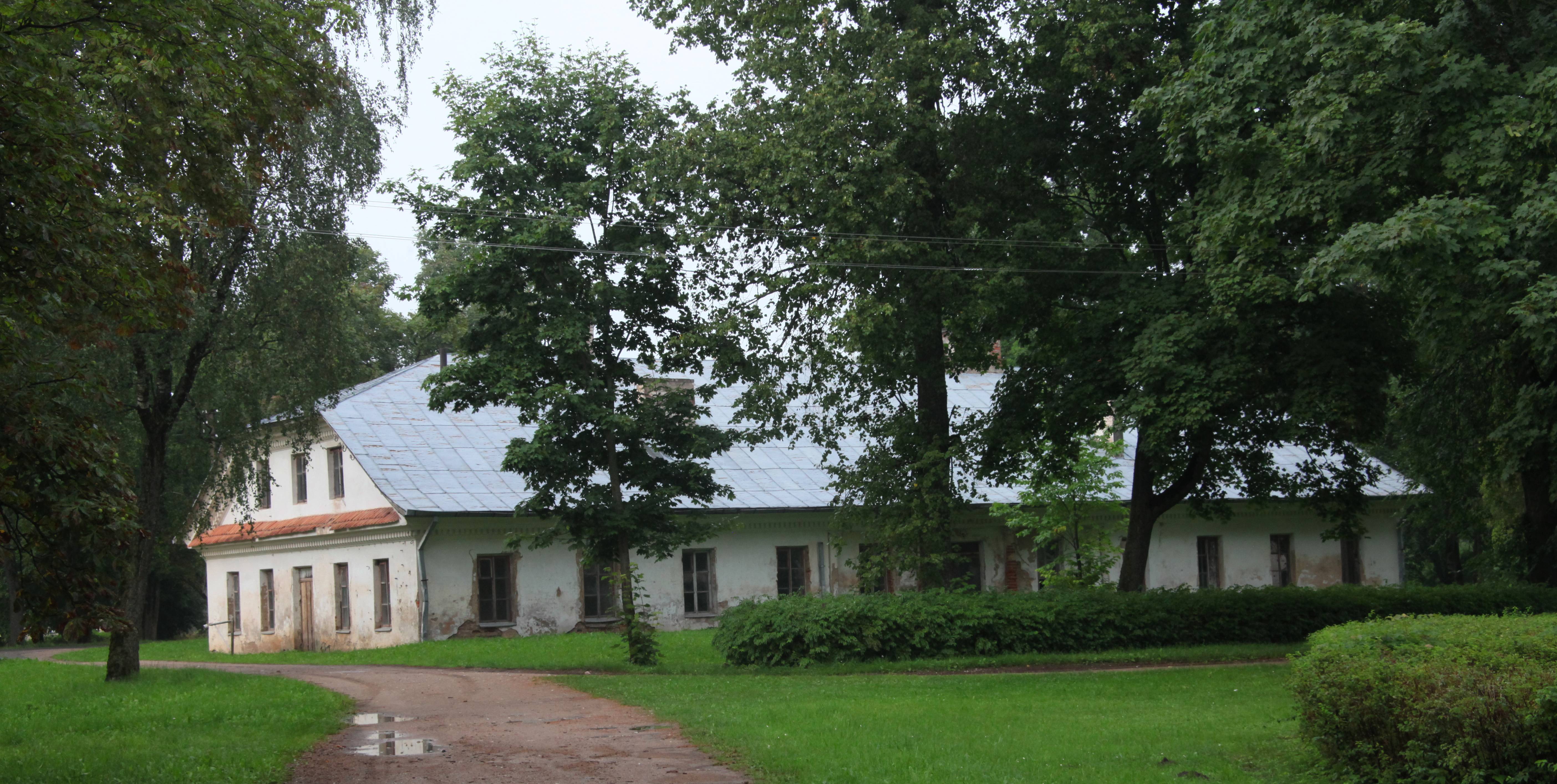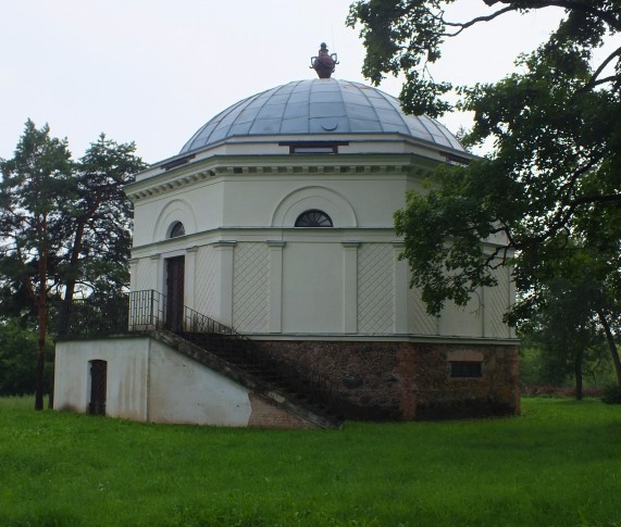 W skład tego kompleksu wchodzą: oficyna i wozownia zbudowane po obu stronach frontowego gazonu, dwa spichlerze w kształcie oktagonalnych rotund nakrytych cylindrycznymi hełmami, oddzielone od siebie aleją wjazdową, której początek znajduje się przy dawnym zajeździe, zbudowanym w stylu neoklasycystycznym i ozdobionym ośmiokolumnowym portykiem.
