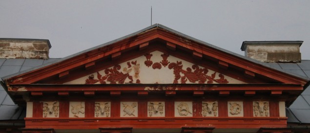 Zarówno elewacja frontowa, jak i ogrodowa została cała do wysokości I piętra pokryta boniami. Budynek otoczył poddachowy gzyms kroksztynowy, takim samym gzymsem został obwiedziony fronton portyku. Na ogrodowej połaci dachu znalazło się sześć półokrągłych, małych lukarn.