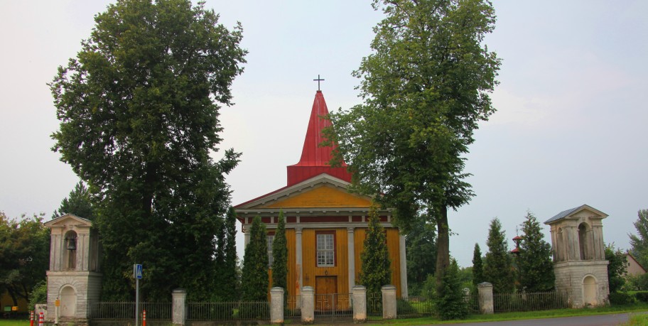 W pobliżu wylotu alei wjazdowej, po jego północnej stronie Józef Komar ufundował drewniany, trójnawowy kościół p.w. św. Stefana, którego budowę zakończono w 1796 roku. Przyścienne kolumny i tryglifowy fryz oraz trójkątny fronton otoczony gzymsem kostkowym w elewacji frontowej nadały mu cechy budowli klasycystycznej. Wnętrze świątyni zdobi prospekt organowy z 1795 roku oraz wiele XVIII- i XIX-wiecznych obrazów. Z obu stron kościoła postawiono w połowie XIX stulecia dwie murowane, niewysokie dzwonnice, również noszące cechy klasycystyczne.
