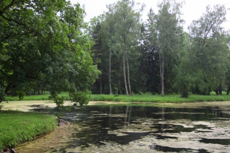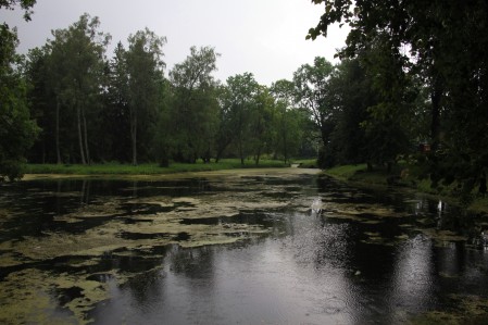 Pałac otoczony był przez 12-hektarowy park o charakterze krajobrazowym, urozmaicony dwoma dużymi stawami. Jeden z nich, z wysepką pośrodku, połączoną ze stałym lądem mostkiem, miał kształt zbliżony do koła. Drugi, nieregularny, znajdował się między bramą wjazdową a pałacem. Przez jego wąski przesmyk przerzucono most, którego strzegły dwa kamienne, XVIII-wieczne lwy. W parku obok rodzimych lip, kasztanowców, dębów, świerków rosły również żywotniki, czerwone buki i grochodrzewy..