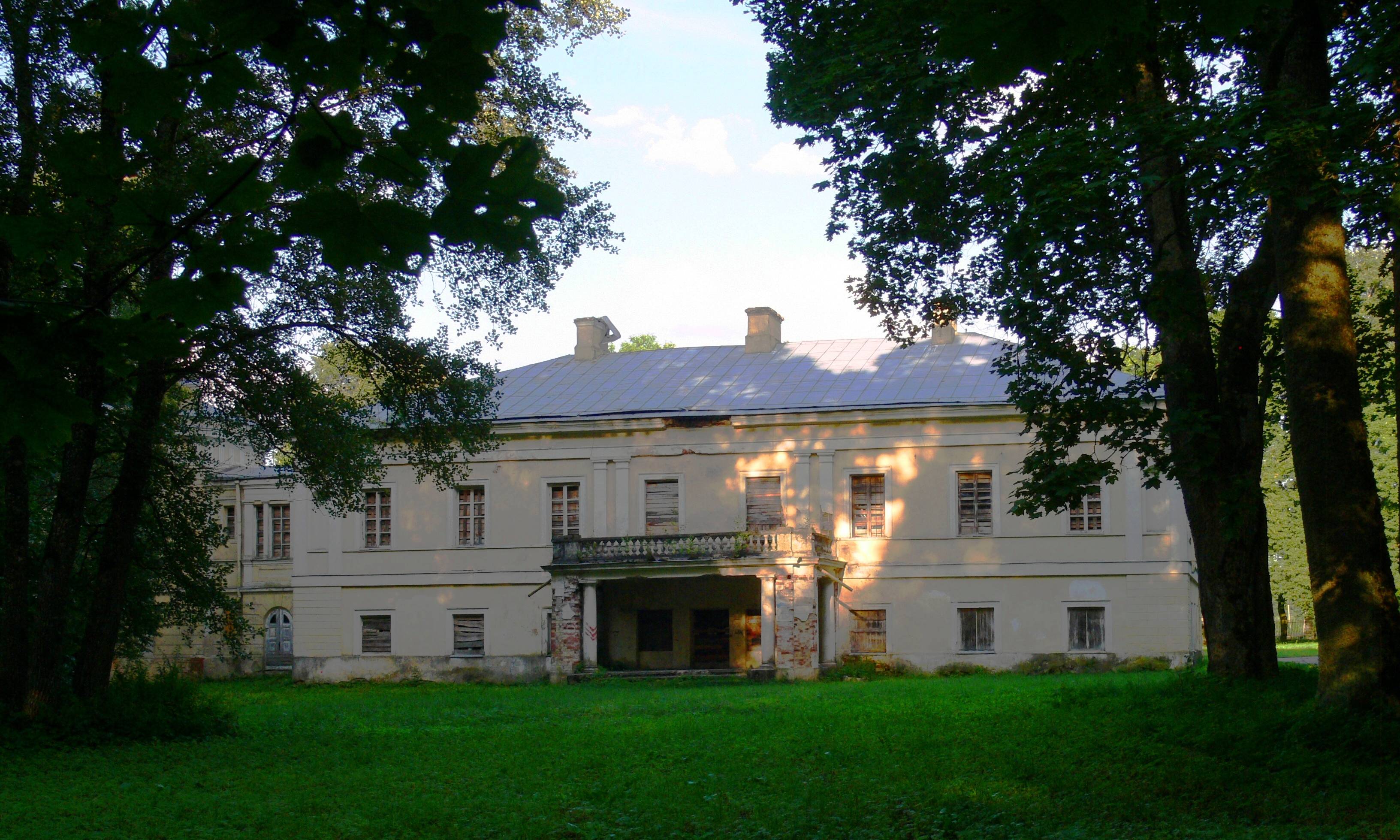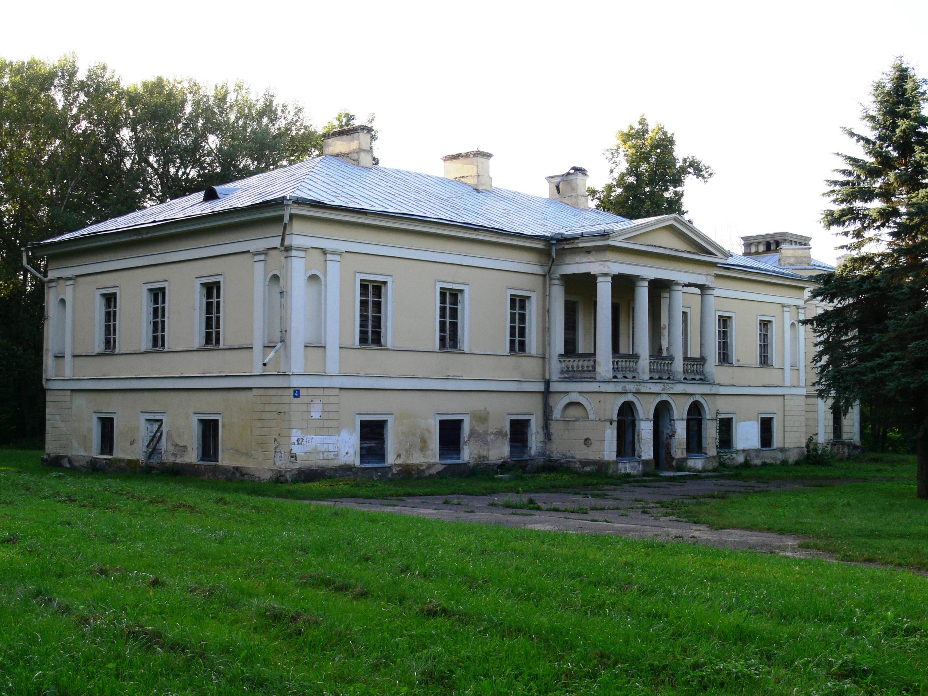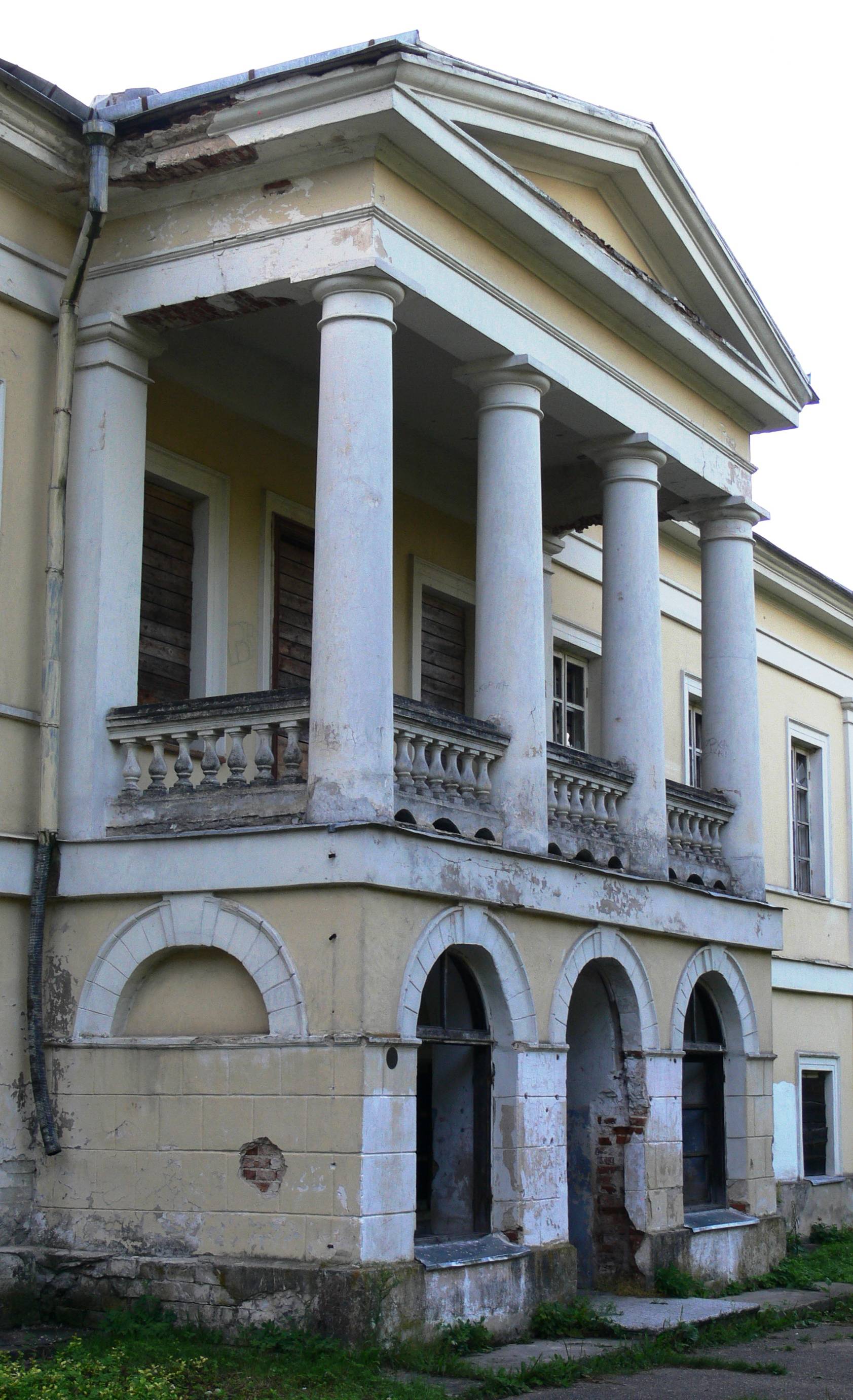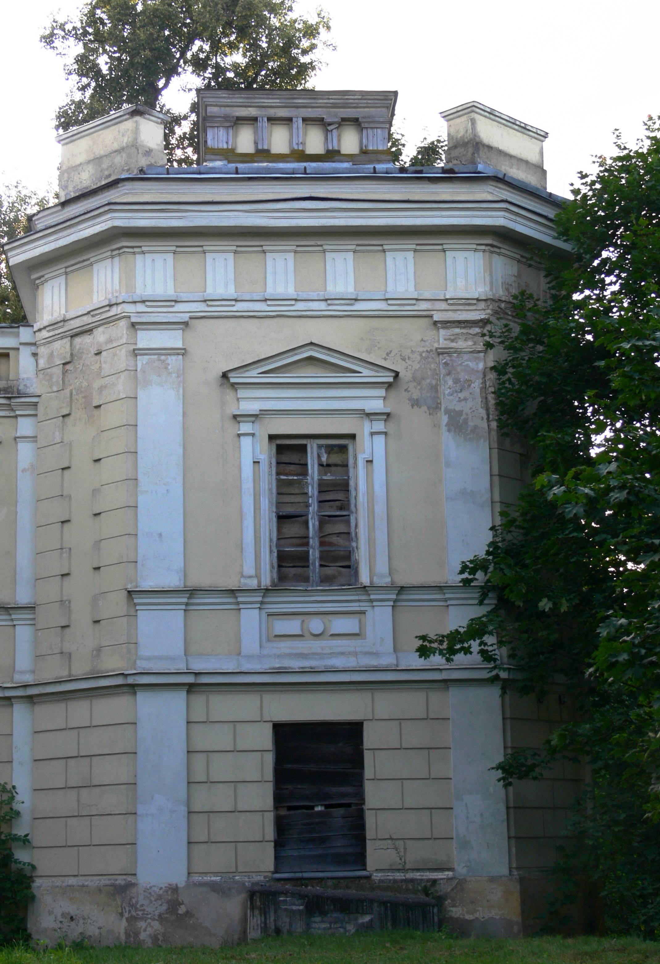 Po czterech latach wśród drzew dwuhektarowego parku stanęła na planie regularnego prostokąta budowla murowana, dwukondygnacyjna, dziewięcioosiowa, pokryta czterospadowym dachem gontowym. Trzyosiową część środkową elewacji frontowej poprzedził portyk utworzony na parterze przez pięć półkoliście zamkniętych arkad, na piętrze natomiast przez cztery kolumny dźwigające belkowanie i szczyt w formie spłaszczonego trójkąta, pozbawionego jakichkolwiek ozdób. Za skrajnymi kolumnami, przy ścianie elewacji znalazły się dwa masywne pilastry. Biegła od nich do kolumn oraz między kolumnami tralkowa balustrada, otaczająca dość obszerny balkon.